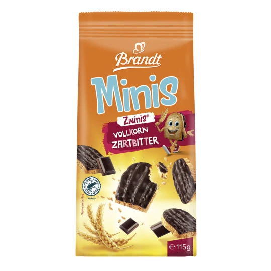 Für alle Liebhaber von dunkler Schokolade gibt es die Brandt Minis Vollkorn Zartbitter. Durch ihren hohen Vollkornanteil spenden sie lange Energie und sind der ideale Snack für zwischendurch, die kleine Pause oder unterwegs. Auch die Mini Zwiebäcke backen wir ganz nach Brandt-Tradition. Denn nur so erhalten sie den gleichen, leckeren Röstgeschmack wie unsere großen Goldstücke.
